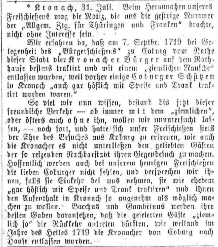 So viel wir nun wissen, bestand bis jetzt dieser freundliche Verkehr - ob immer mit dem "ziemlichen", oder öfters auch ohne ihn, wollen wir ununtersucht lassen, - noch fort, und hatte sich unser Freischießen stets der Ehre des Besuchs aus Koburg zu erfreuen, wie auch die Kronacher es nicht unterließen den geliebten Gästen der so reizenden Nachbarstadt ihren Gegenbesuch zu machen. Hoffentlich werden auch bei unserem heurigen Freischießen die lieben Coburger nicht fehlen, und versprechen wir ihnen, falls sie Einkehr bei uns nehmen, sie wie ehedem "gar höflich mit Spieß und Trank traktiren" und ihnen den Aufenthalt in Kronach so angenehm als möglich machen zu wollen. Bachus und Gambrinus werden ihre besten Gaben daransetzen, daß die gefeierten Gäste "ziemlich so" die Rückkehr antreten dürften, wie weiland im Jahre des Heils 1719 die Kronacher von Coburg nach Hause entlassen wurden.